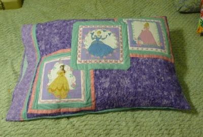 You can't have a quilt and not have a matching pillowcase. So, I gathered up all the scraps left over from making the princess quilt. I fiddled with it for a couple of hours and found an arrangement I could live with. I only wish that I had purchased the seafoam green fabric before I had started on the cutting and sewing of the pink fabric to the quilt. The back of the pillowcase is what was left of the seafoam green. The pillow case blends much better. What do you think?